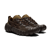 「新しいアイテムを取り入れるようになってから、足元もイメチェンしたくなりました! ボリューム感のある“DENTIGRE LS”はクッション性があって履き心地も快適。ディープブラウンは、どんな服にも合わせやすい」。異素材をMIXしたアッパーが奥行きを作る、新感覚の一足。つま先と踵に厚みを持たせたボリューム系ソールも可愛い。ラウンドフォルムのショルダーバッグは、タイガーの刺しゅうとスポーティなドローコードがアクティブな印象に。お気に入りのチャームを付けて畠山さんらしく飾った。