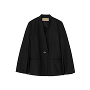 ドット柄のワンピースの上には、袖にスリットが入ったブラックジャケットを羽織った。「フォルムが美しくラインが構築的な印象を持ちましたが、動くと軽くしなやかで柔らかい着心地に驚きました」。フロントのシルバーボタンもアクセントに。