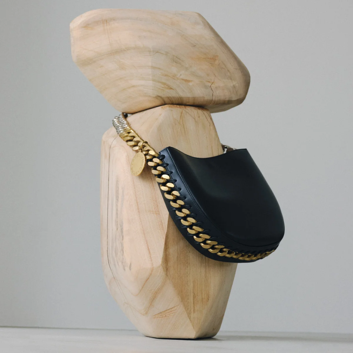 「ファラベラ」は、さまざまなヴィーガンレザー素材を使用したボディに、ダイヤモンドカットチェーンのアウトラインとハンドル、チェーンに付属する丸いロゴメダリオンが特徴。毎シーズン異なる素材、デザインにアップデートされるとともに、ラグジュアリーブランドが提案するサステイナビリティの可能性を提示・牽引し続けている。