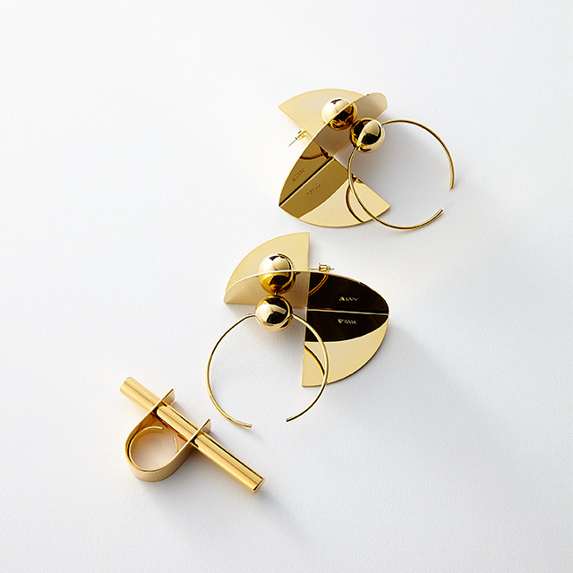 スタイルのアクセントになるキャッチーなゴールドアクセサリー。 ミニマムでアーティなフォルムが美しいインパクト大のピアスとリングで、モードなエッセンスを加えて。